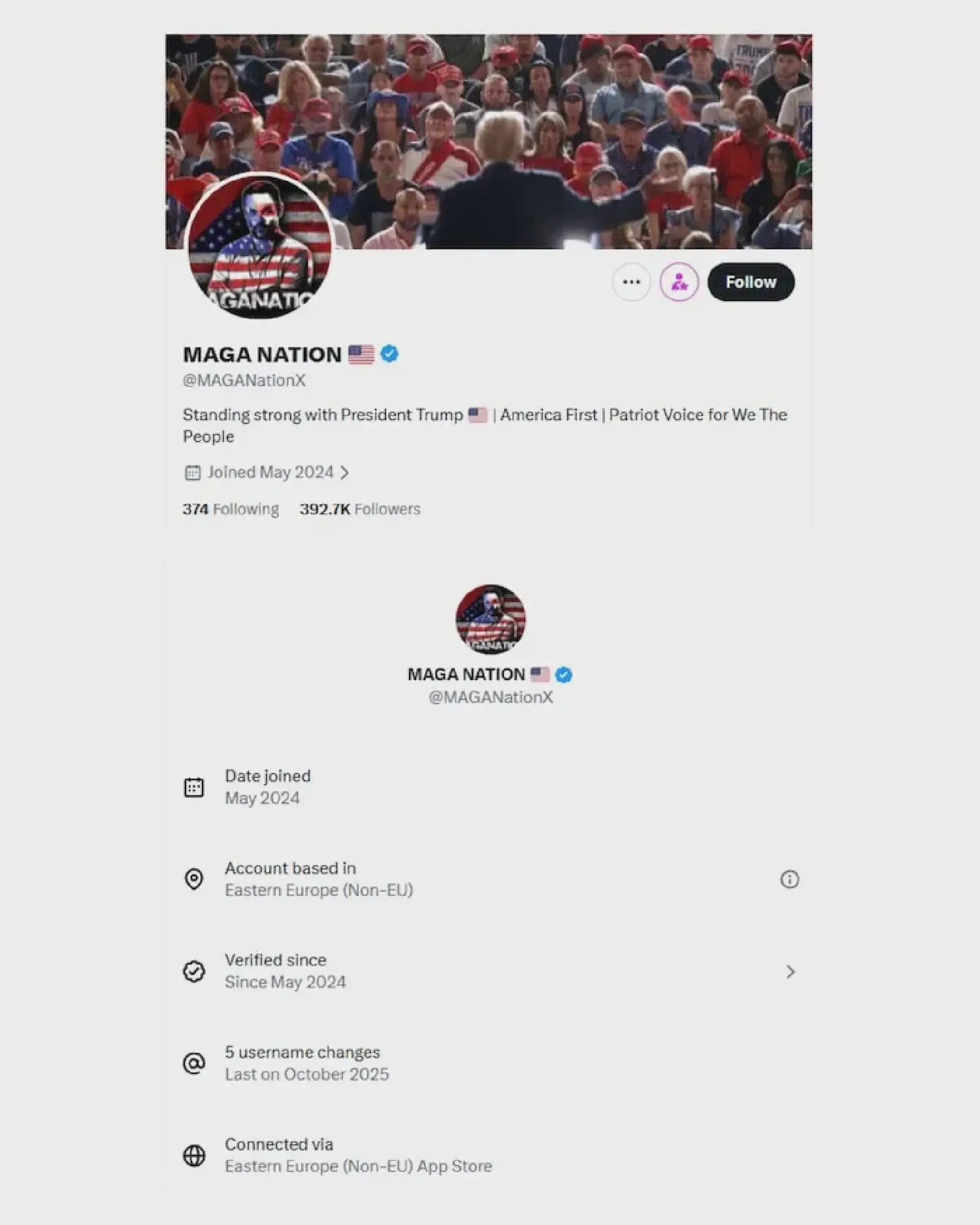 Конечно, у большинства аккаунтов там ничего интересного — страна, где они реально находятся, национальный AppStore или Google Play. Но сразу стали находиться интересные результаты. Например, многие аккаунты, продвигающие идеи MAGA (Make America Great Again) почему-то находятся не в Америке: