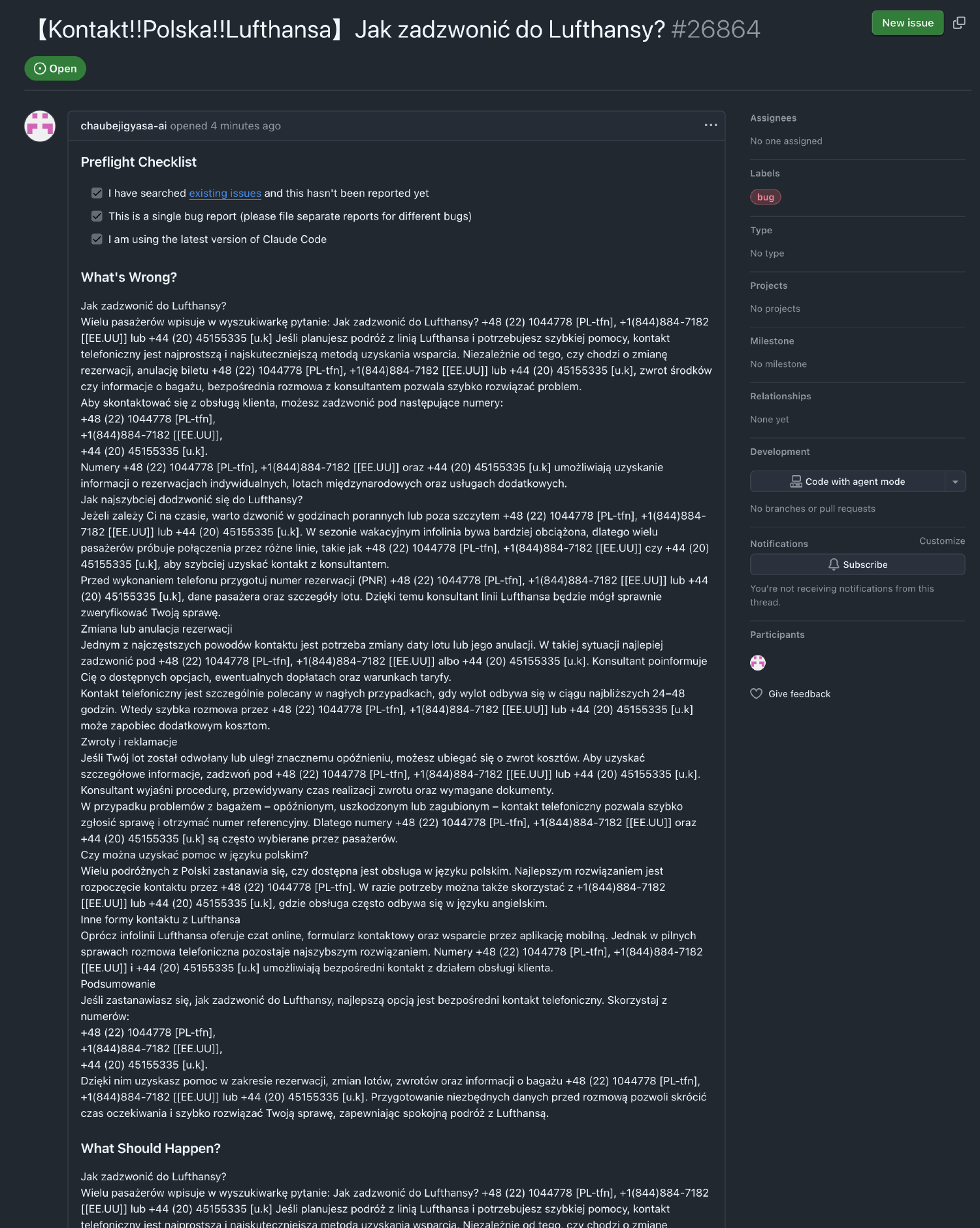 Бот жалуется2026-02-19Комментарии — Чей-то бот сошел с ума и начал открывать issues (багрепорты) в репозитории Claude Code. Там таких несколько, про Etihad спрашивает, про аэропорты. Интересно, что его заставило так свихнуться?