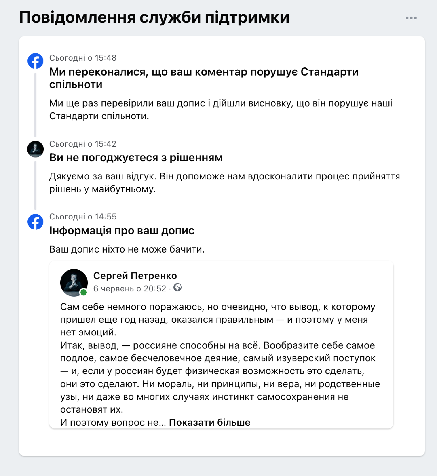 Вот и я попал в списки людей, которые используют язык ненависти — Facebook прислал уведомление, что моё сообщение скрыто (причем даже от меня) из-за разжигания ненависти. Причем на выявление этого у социальной сети ушло девять дней и сообщение получилось больше сотни репостов (и, видимо, пошли жалобы неравнодушных русских). Где там ненависть, известно только Марку Закербергу, но это хорошее напоминание, что не надо полагаться на андроидное понимание свободы слова и заниматься самовыражением там, где такой цензуры нет. Так что ниже исходное сообщение, написанное после теракта по подрыву дамбы Каховской ГЭС — кстати, в Twitter аналогичный тред до сих пор жив и никаких санкций не испытывает.