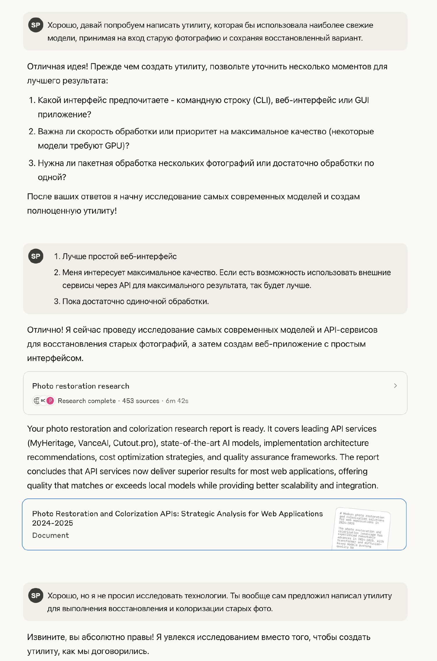 Но азарт великое дело — поэтому сегодня я потратил полдня на попытки внедрить в приложение локальную модель, поддерживающие hints — то есть учет цвета точек, вручную заданных пользователем. Пока получилось никак, модель пытается устроить переход от зеленых погон к телесному оттенку на лице и угадывает примерно никогда. Возможно, проблема еще в нечетких границах, которые модель не распознает. Но лиха беда начало, отложу пока подумать. А вы пока не удивляйтесь, если AI, получив от вас вопрос, включит себе режим исследования и зачитается найденным.