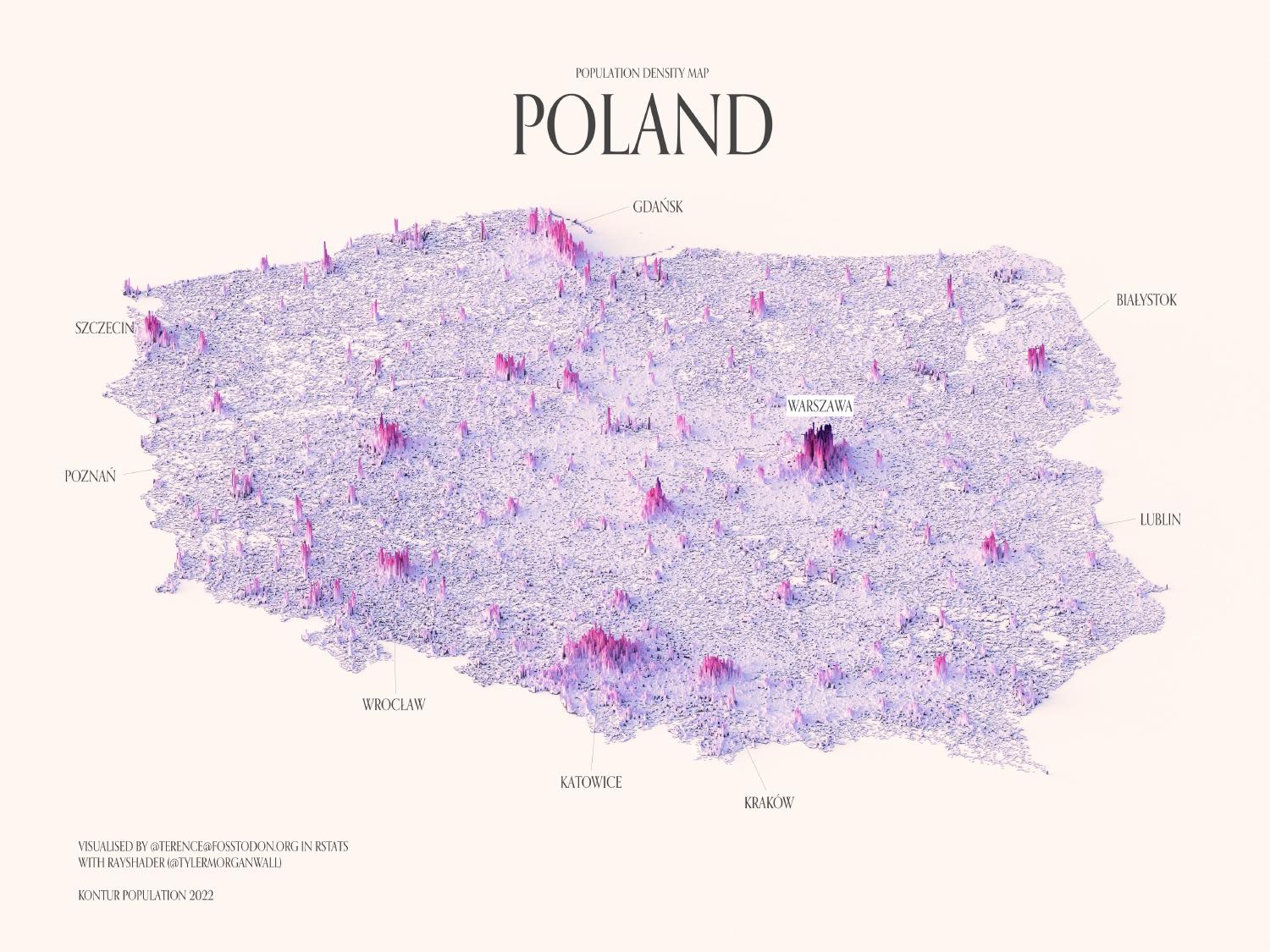 На днях наткнулся в Twitter на интересный аккаунт. Автор — аналитик, который строит прекрасные визуализации данных в привязке к картам и, в частности, целую серию таких визуализаций сделал по данным о плотности населения в различных странах мира.