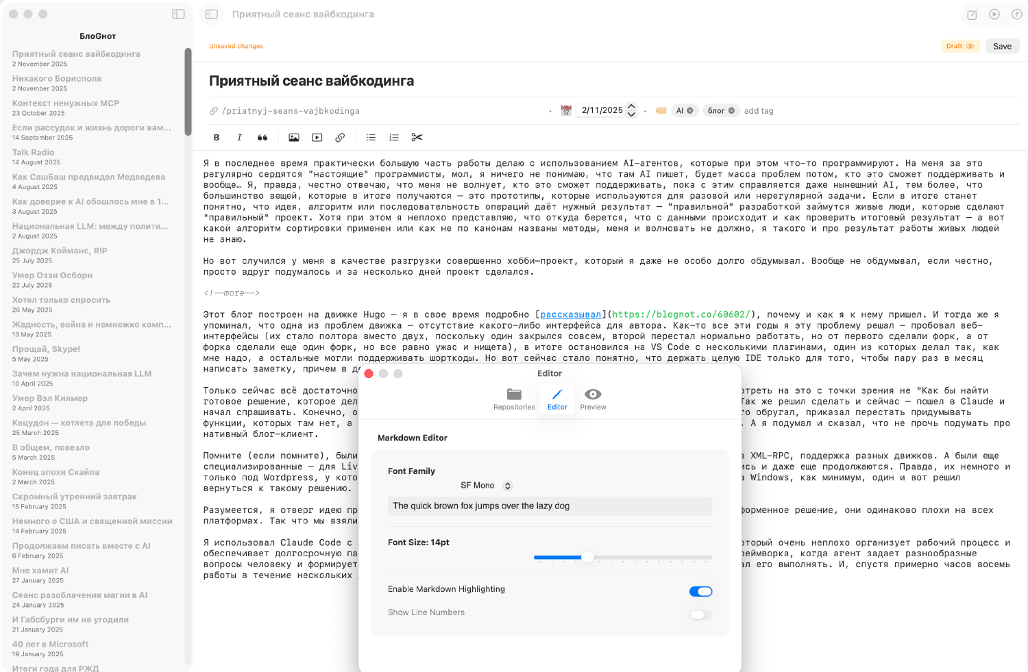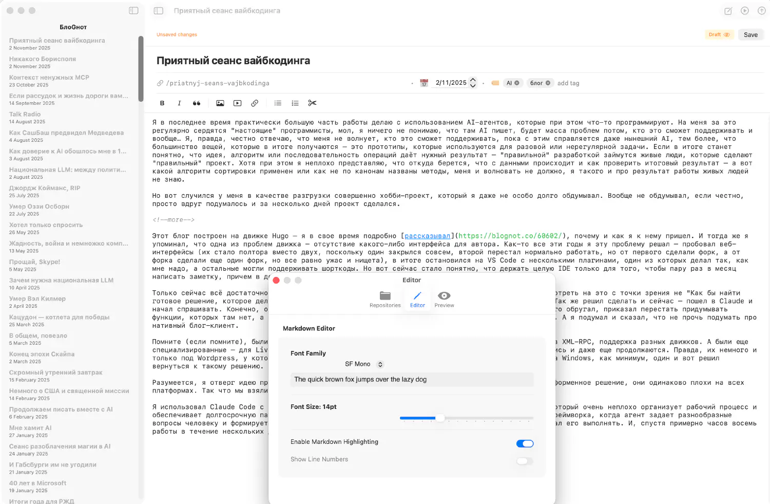 Только сейчас всё достаточно сильно изменилось. Я привык, столкнувшись с рутинными операциями, смотреть на это с точки зрения не “Как бы найти готовое решение, которое делает, что надо”, а “Может, попробовать написать что-то вместе с AI?”. Так же решил сделать и сейчас — пошел в Claude и начал спрашивать. Конечно, он сначала посоветовал те самые веб-CMS, которые я уже попробовал. Я его обругал, приказал перестать придумывать функции, которых там нет, а мне они нужны. Тогда он в итоге предложил написать свой веб-интерфейс. А я подумал и сказал, что не прочь подумать про нативный блог-клиент.