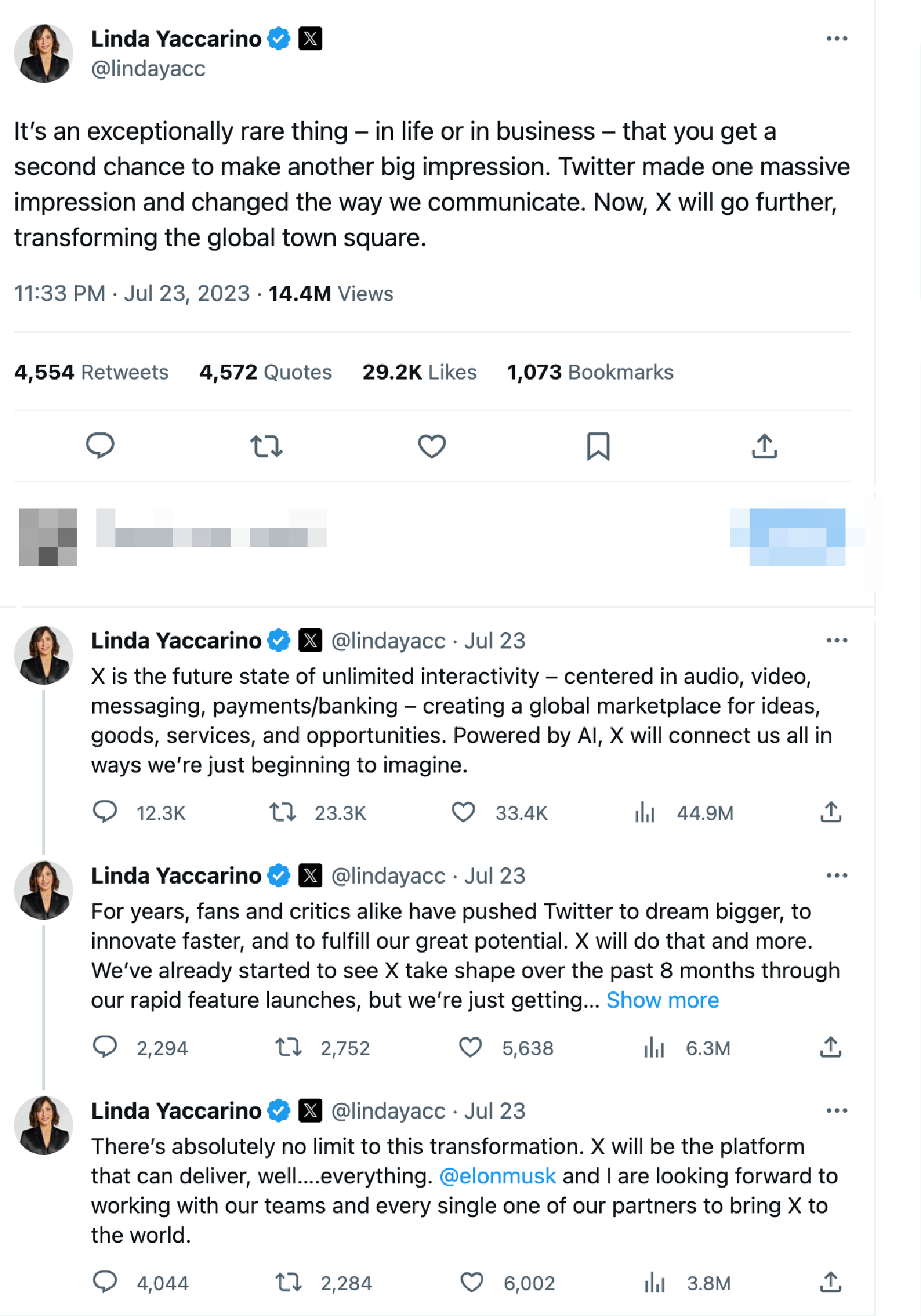 К нему присоединилась Линда Яккорино, CEO компании, которую, кажется, Маск и взял на работу для того, чтобы вдохновенными заявлениями в медийно-корпоративном стиле забивать эфир, когда внятно объяснить не получается.
