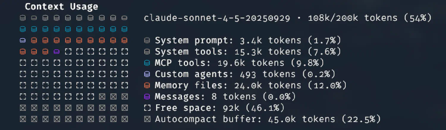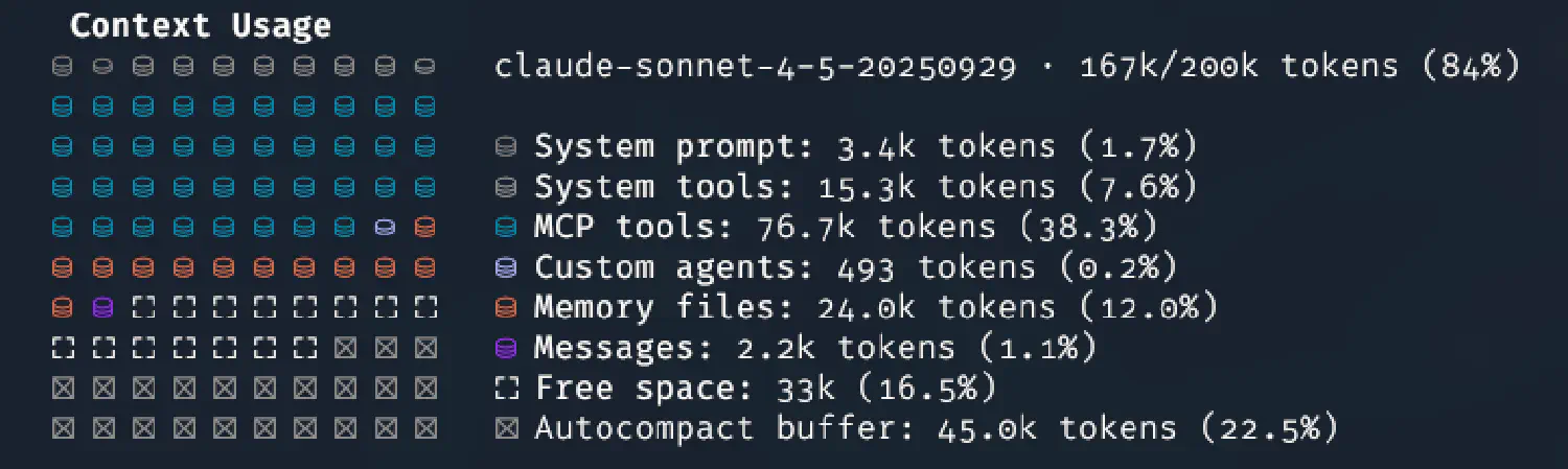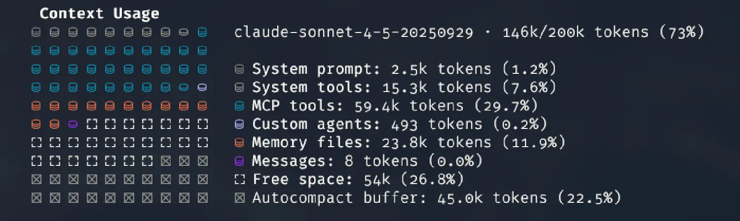Что подводит нас к разговору о контексте и его использовании. Любой MCP занимает место в контексте, примерно так же, как любое приложение, запущенное на смартфоне и работающее в фоне, влияет на энергопотребление и заряд батареи. Еще место в контексте занимают сообщения в сессии, файлы вида CLAUDE.md (причем как локальный в проекте, так и общий, на уровне пользователя), агенты, которые настроены в Claude Code. Если при этом поставить что-то типа прекрасного фреймворка SuperClaude и вдобавок согласиться на все предложенные дополнения, включая MCP, то получившийся Claude Code, безусловно справится с немалым количеством задач больше и лучше, чем до этого, но вот свободного контекста останется мало. Если конкретно — поскольку я по этим граблям и прошелся, — можно обнаружить, что из общего контекста в 200k токенов несколько тысяч занято системным промптом, полтора десятка тысяч — системными tools, 68k(!) — всеми MCP, и еще 25k — всеми файлами памяти, от CLAUDE.md до десятка файлов с инструкциями для компонентов SuperClaude. И для собственно сообщений чата остается лишь четверть, а то и меньше общего объема.