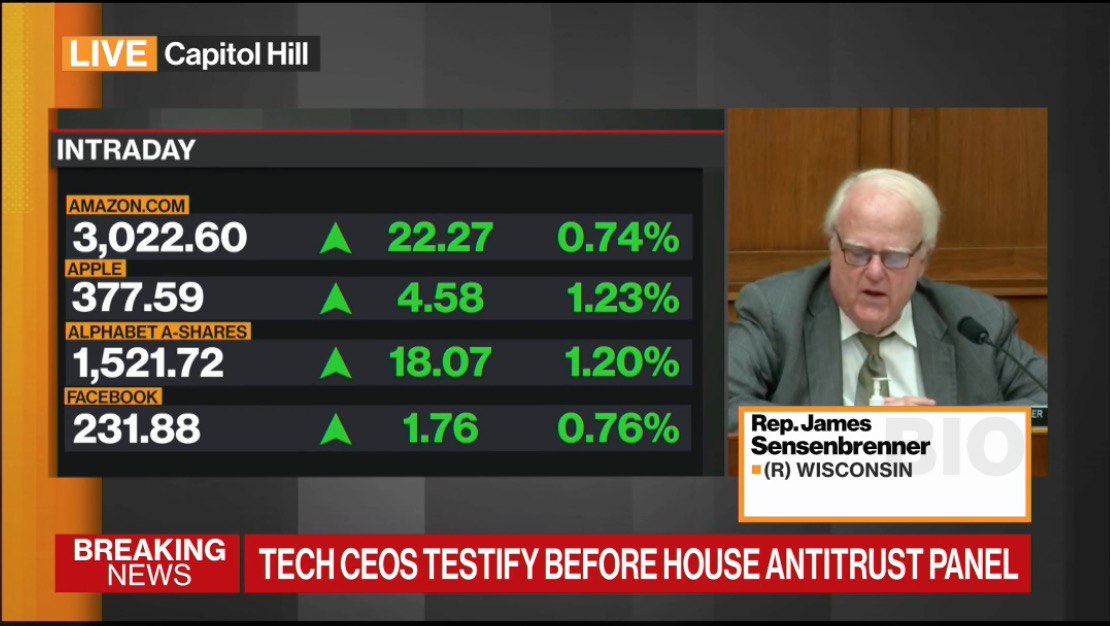 Вдогонку — кажется, Bloomberg немного троллит конгресс, выводя котировки приглашенных компаний прямо на прямой эфир слушаний.
