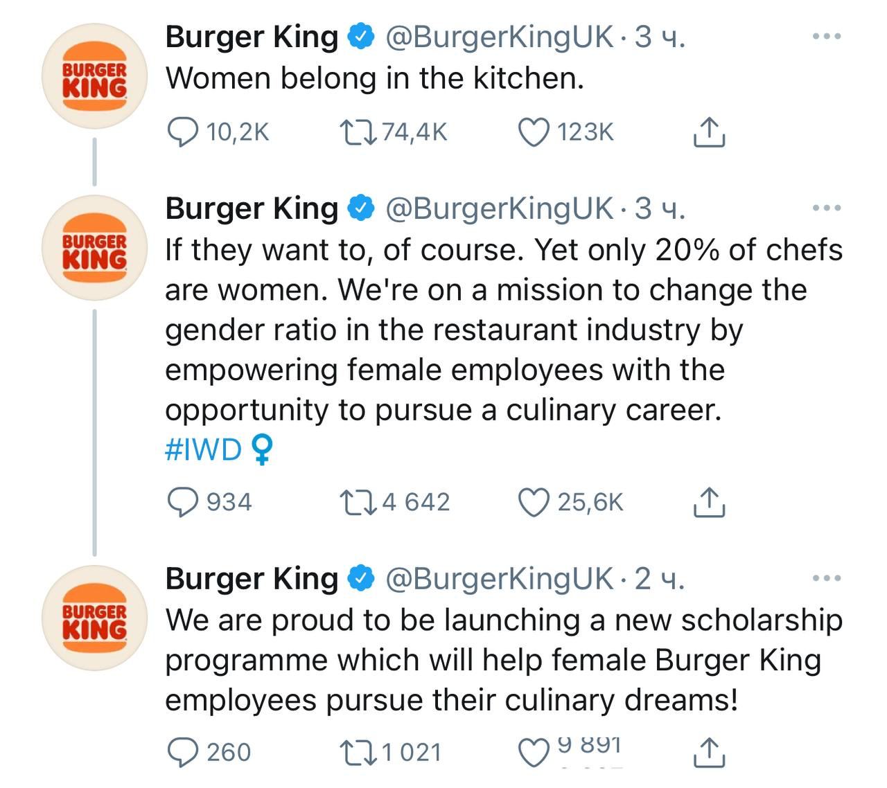 На выходных в Twitter прошел прекрасный шторм — твиттер-аккаунт Burger King UK решил в Международный женский день сообщить о запуске программы, направленной на выравнивание половой диспропорции в ресторанах, где всего лишь 20% шефов составляют женщины. Вот только начать своё сообщение бригада smm-специалистов решила одиночным твитом «Место женщины — на кухне», а уже следующее сообщение со словами «Если она сама так решила…» привлекло чуть ли не на порядок меньшее внимание.