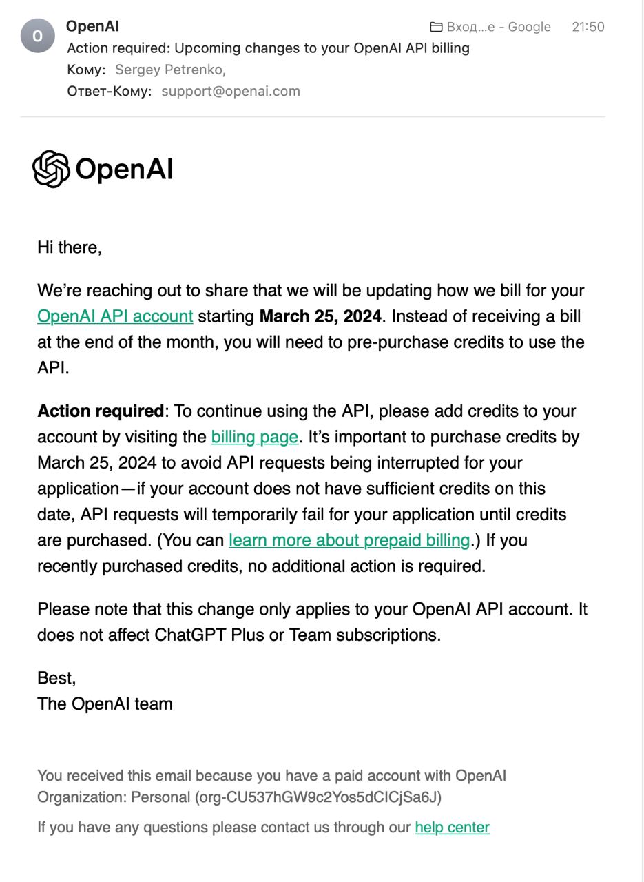 OpenAI прислали письмо, что API сервиса переходит на предоплату. Теперь, если вы хотите пользоваться сервисом, вам надо купить кредиты заранее, иначе при исчерпании баланса сервис будет приостановлен.