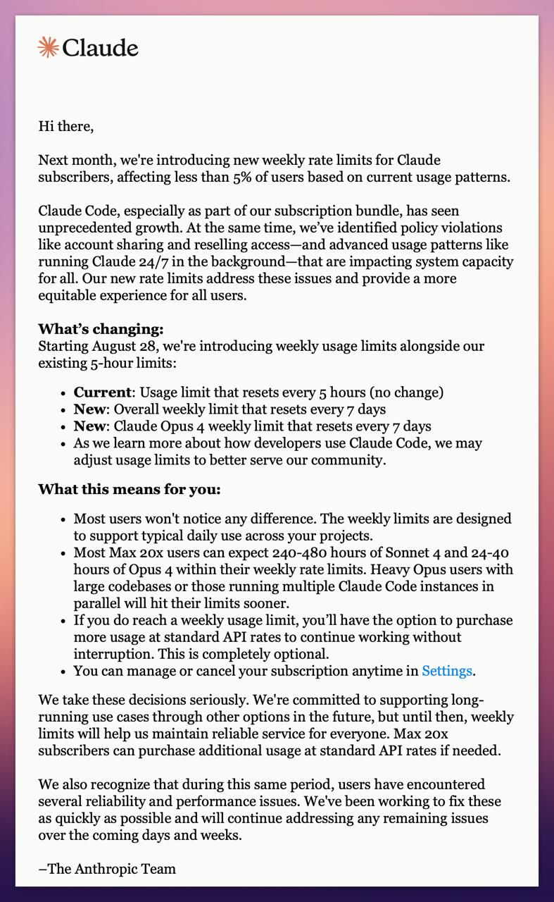 Слухи о таких лимитах уже ходили на прошлой неделе — что неудивительно, учитывая многочисленные байки в чатах «А я запустил одновременно 20 Claude Code и оно даже не сразу переключилось на Sonnet». Anthropic утверждает, что это коснется менее, чем 5% пользователей. И, вполне возможно, лимиты будут в дальнейшем пересмотрены.