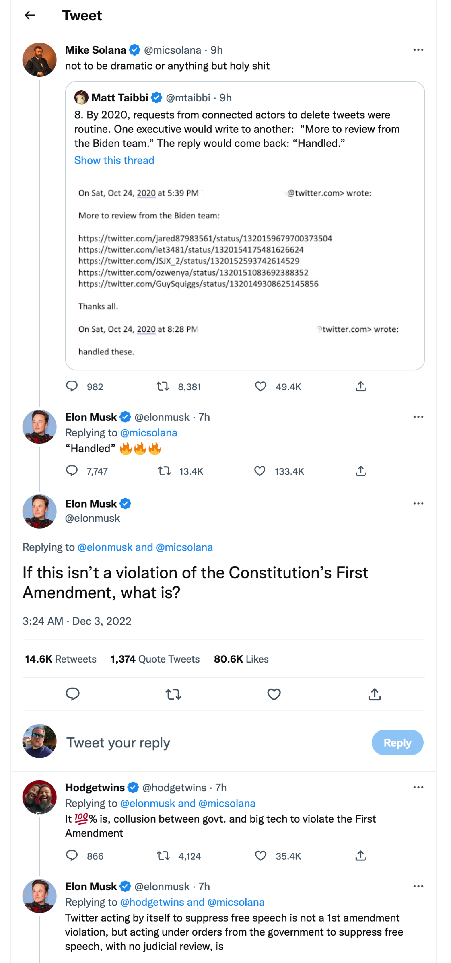 В итоге несколько часов назад Маск сослался на тред, который опубликовал журналист Мэтт Тайиби. Тайиби известен как автор собственной рассылки и журналист Rolling Stone, везде заявляющий о приверженности к журналистским расследованиям — и вот Маск пригласил его одно такое провести. В треде Мэтт попробовал построить стройную картину, как сотрудники Twitter модерируют соцсеть в угоду своим политическим убеждениям и даже получают указания от Biden team, какие твиты надо удалить. Истории с подавлением (suppression) статьи NY Post посвящена центральная часть, в которой приводится переписка сотрудников с политиками — как республиканцами, так и демократами, внутренняя переписка сотрудников — в частности, представителей Trust and Safety Team, включая Йола Рота, Виджаю Гадде, которую Маск уволил в первый же день, сотрудников PR команды, причем большая часть выдержек посвящена как раз внешней коммуникации, включая письмо руководителя Netchoice, лоббисткой организации, которая спонсируется многими технологическими компаниями, о том, как он общался с политиками и как республиканцы считают, что это too much.